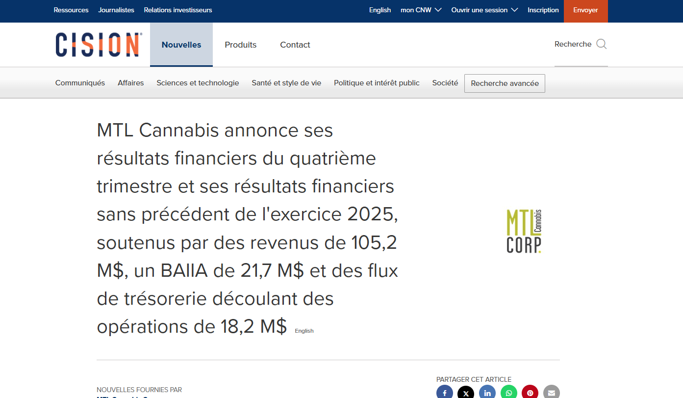 MTL CANNABIS ANNONCE SES RÉSULTATS FINANCIERS DU QUATRIÈME TRIMESTRE ET SES RÉSULTATS FINANCIERS SANS PRÉCÉDENT DE L’EXERCICE 2025