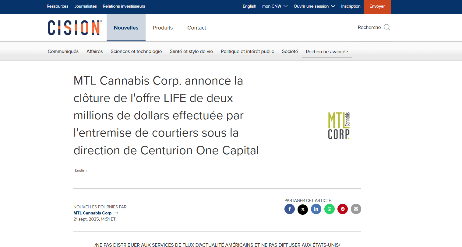 MTL CANNABIS CORP. ANNONCE LA CLÔTURE DE L’OFFRE LIFE DE DEUX MILLIONS DE DOLLARS EFFECTUÉE PAR L’ENTREMISE DE COURTIERS SOUS LA DIRECTION DE CENTURION ONE CAPITAL
