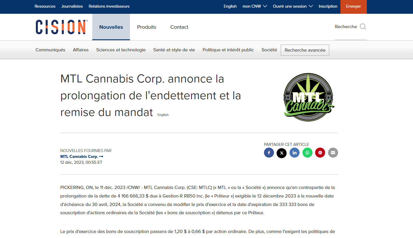 MTL CANNABIS CORP. ANNONCE LA PROLONGATION DE L'ENDETTEMENT ET LA REMISE DU MANDAT