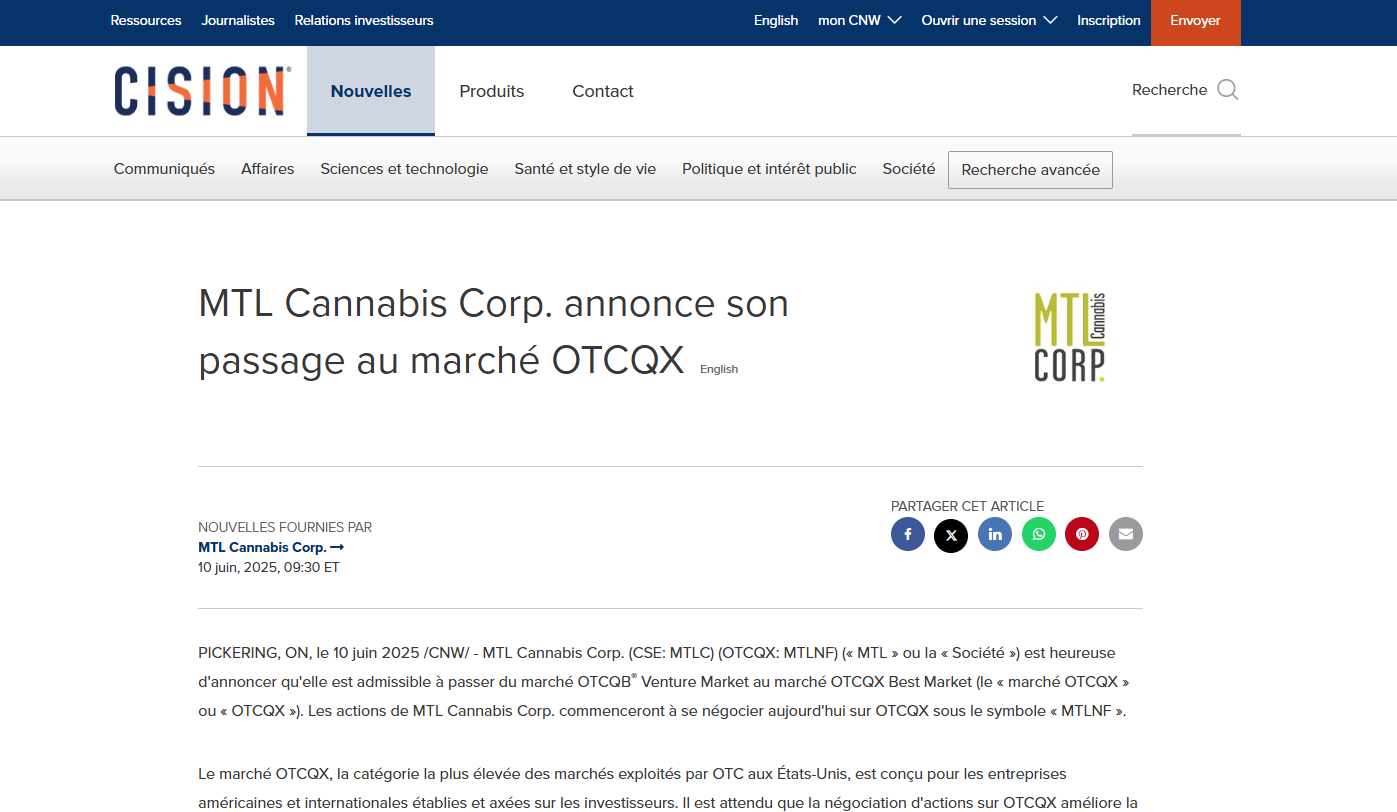 MTL CANNABIS CORP. ANNONCE SON PASSAGE AU MARCHÉ OTCQX