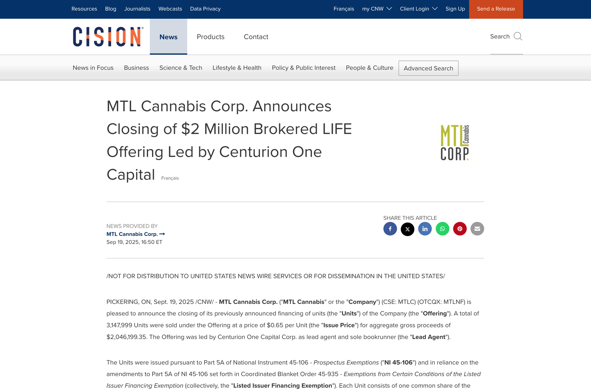MTL CANNABIS CORP. ANNOUNCES CLOSING OF $2 MILLION BROKERED LIFE OFFERING LED BY CENTURION ONE CAPITAL