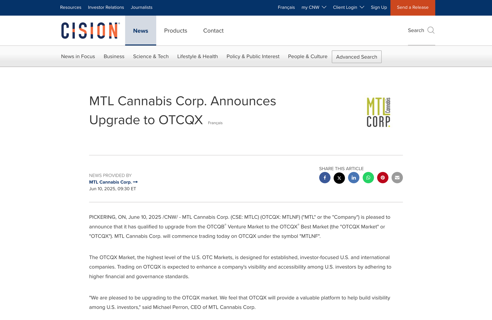 MTL CANNABIS CORP. ANNOUNCES UPGRADE TO OTCQX