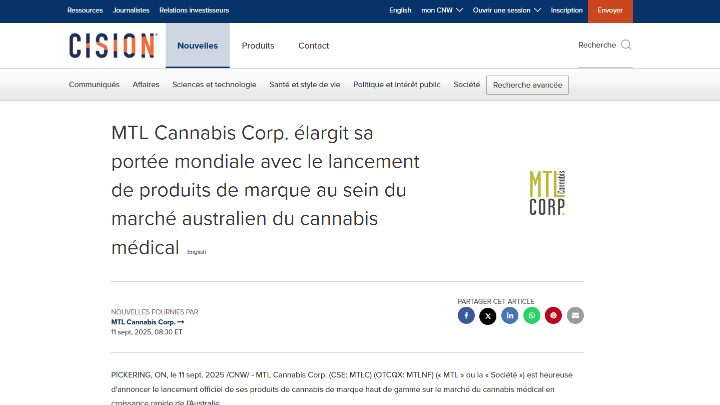 MTL CANNABIS CORP. ÉLARGIT SA PORTÉE MONDIALE AVEC LE LANCEMENT DE PRODUITS DE MARQUE AU SEIN DU MARCHÉ AUSTRALIEN DU CANNABIS MÉDICAL