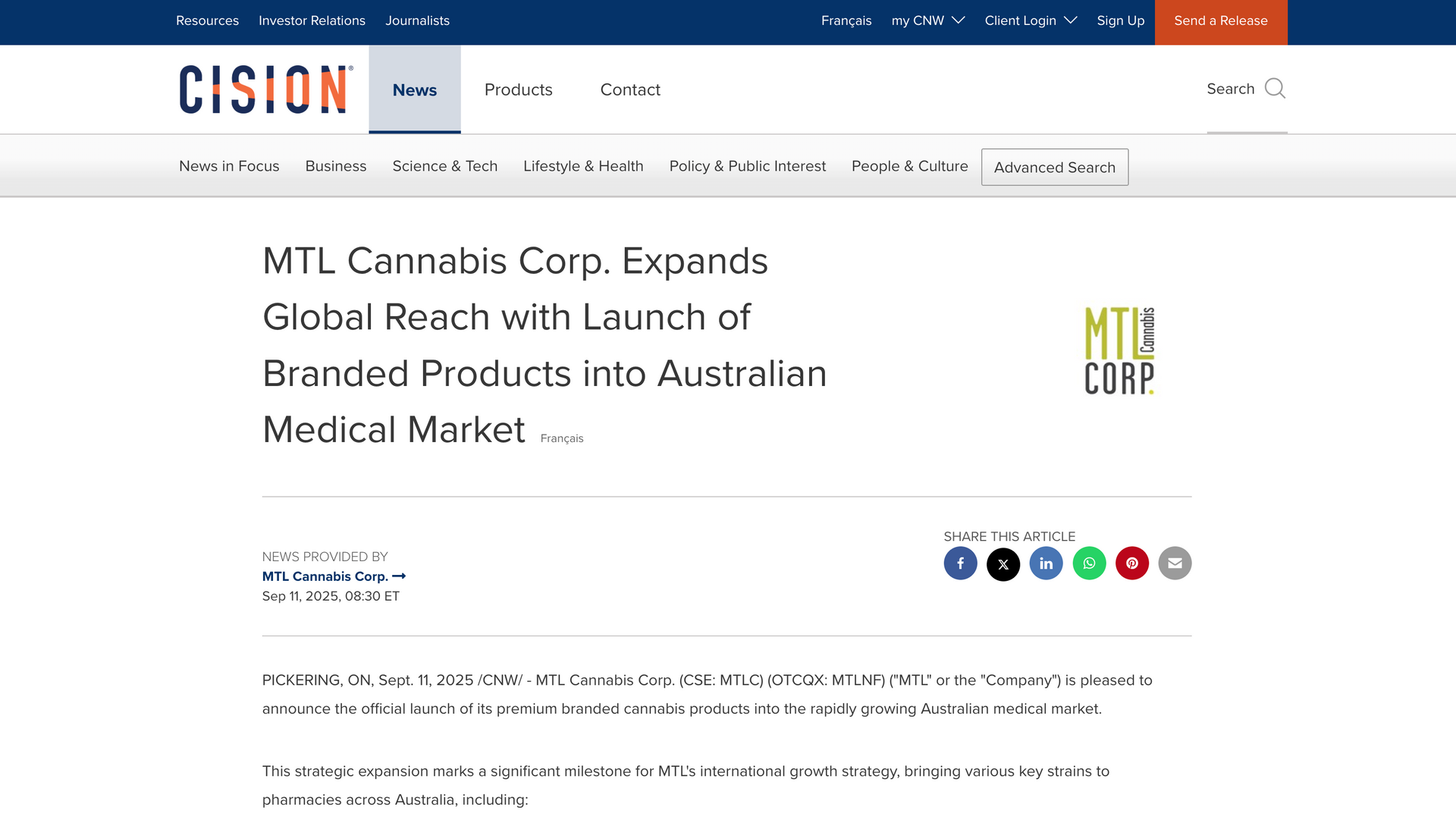 MTL CANNABIS CORP. EXPANDS GLOBAL REACH WITH LAUNCH OF BRANDED PRODUCTS INTO AUSTRALIAN MEDICAL MARKET