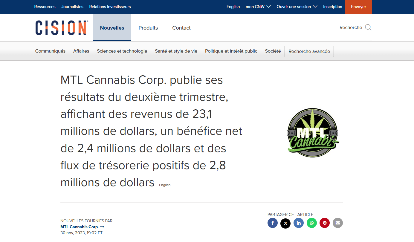 MTL CANNABIS CORP. PUBLIE SES RÉSULTATS DU DEUXIÈME TRIMESTRE, AFFICHANT DES REVENUS DE 23,1 MILLIONS DE DOLLARS, UN BÉNÉFICE NET DE 2,4 MILLIONS DE DOLLARS ET DES FLUX DE TRÉSORERIE POSITIFS DE 2,8 M