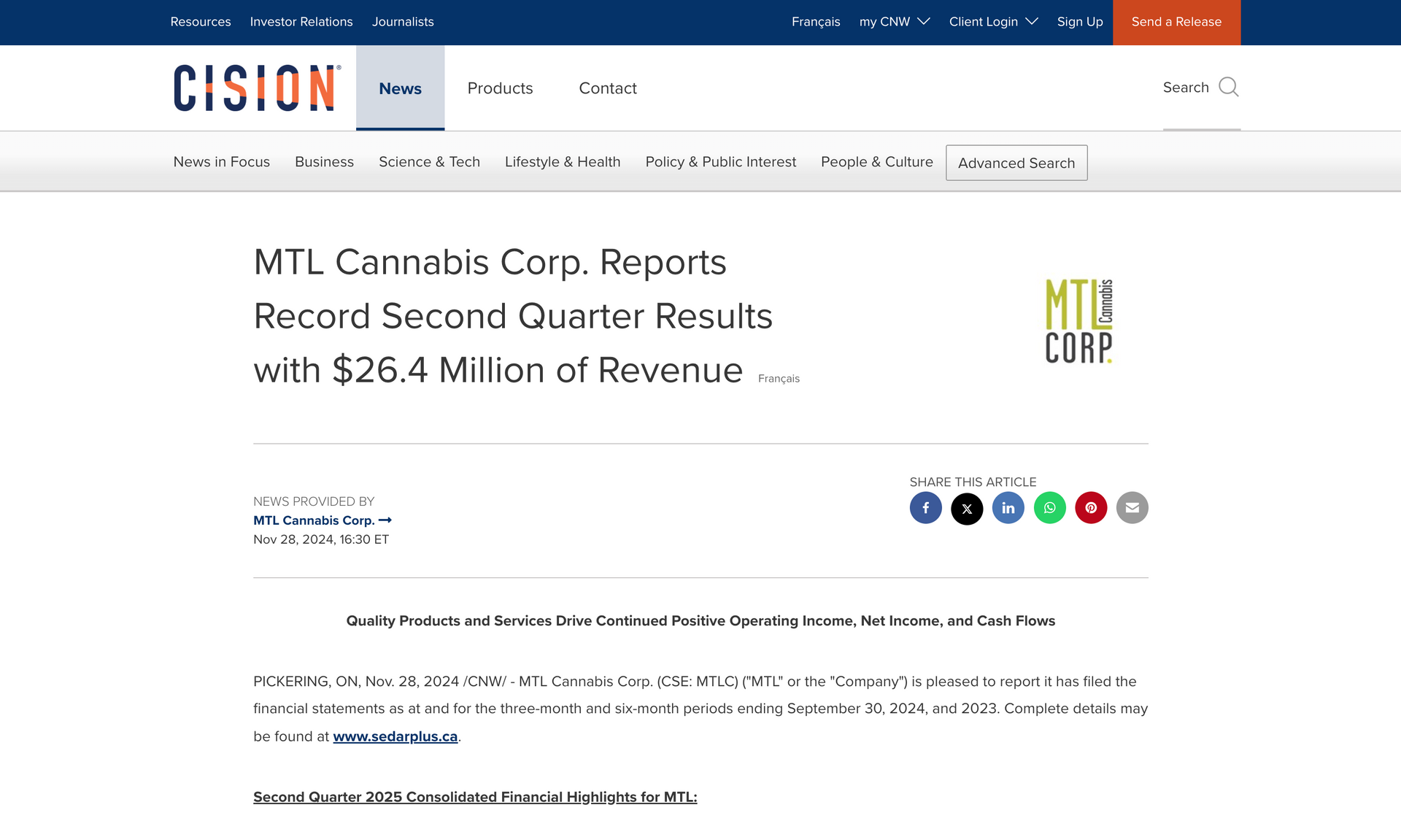 "We are immensely proud of our record-breaking results this quarter, demonstrating momentum in our strategic growth and ability to deliver sustainable value for shareholders, "said Michael Perron, CEO of MTL. "These results reflect the high-quality of our team and their efforts to deliver the best products and services to our customers and medical patients."