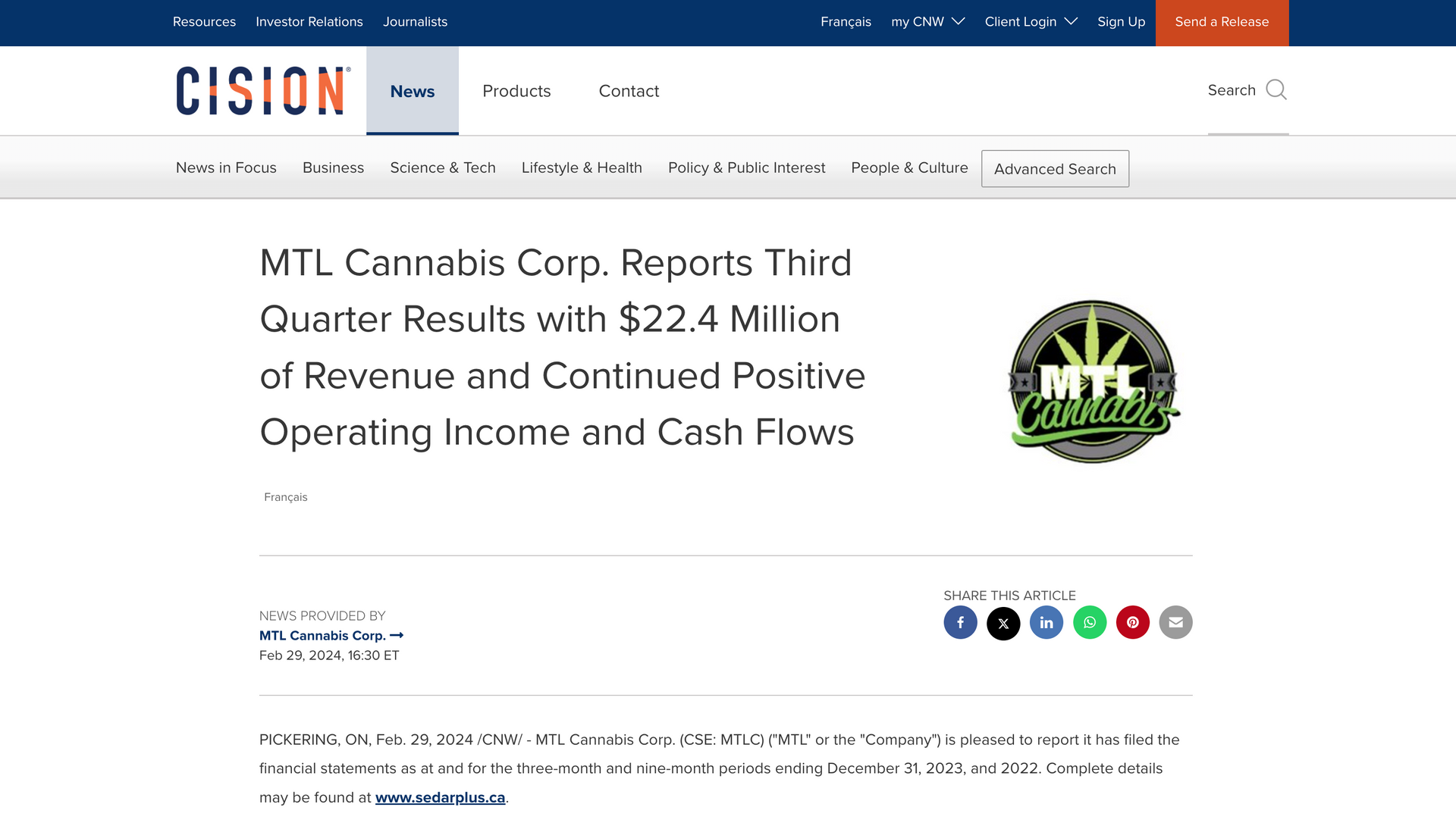 MTL CANNABIS CORP. REPORTS THIRD QUARTER RESULTS WITH $22.4 MILLION OF REVENUE AND CONTINUED POSITIVE OPERATING INCOME AND CASH FLOWS