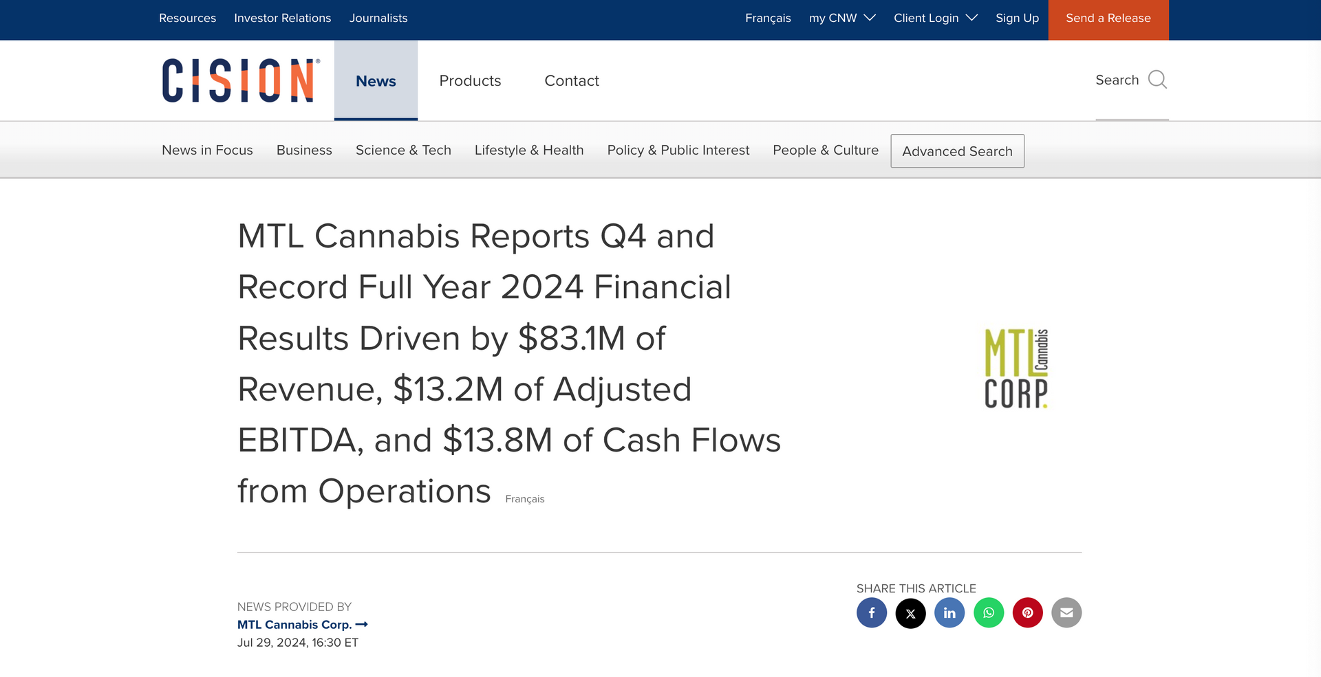 MTL CANNABIS REPORTS Q4 AND RECORD FULL YEAR 2024 FINANCIAL RESULTS DRIVEN BY $83.1M OF REVENUE, $13.2M OF ADJUSTED EBITDA, AND $13.8M OF CASH FLOWS FROM OPERATIONS